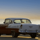 RED AND WHITE CLASSIC CAR ON THE BEACH