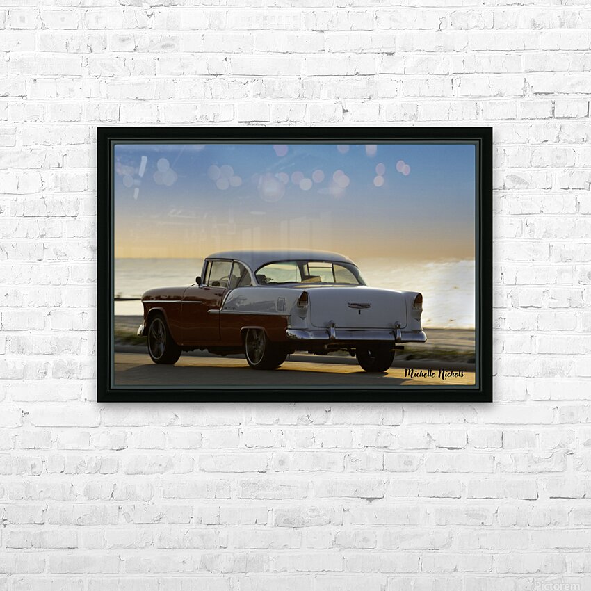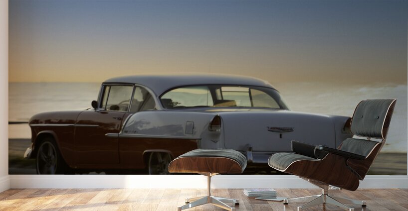 ABOUT THIS ARTWORK: RED AND WHITE CLASSIC CAR ON THE BEACH