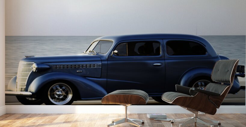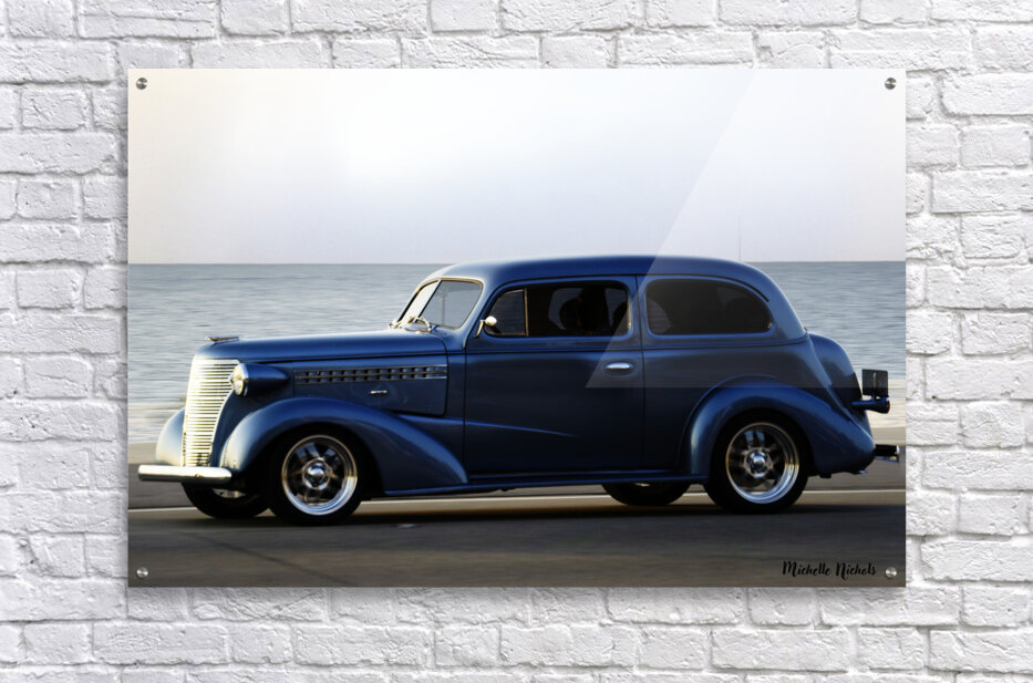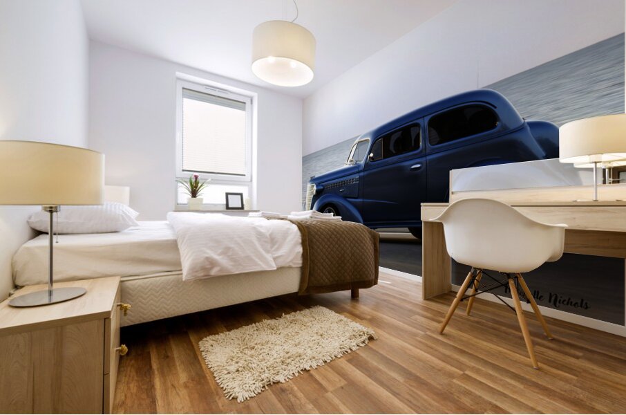 ABOUT THIS ARTWORK: ROYAL BLUE CLASSIC CAR ON THE BEACH
