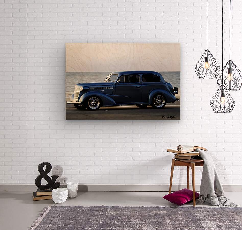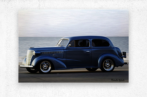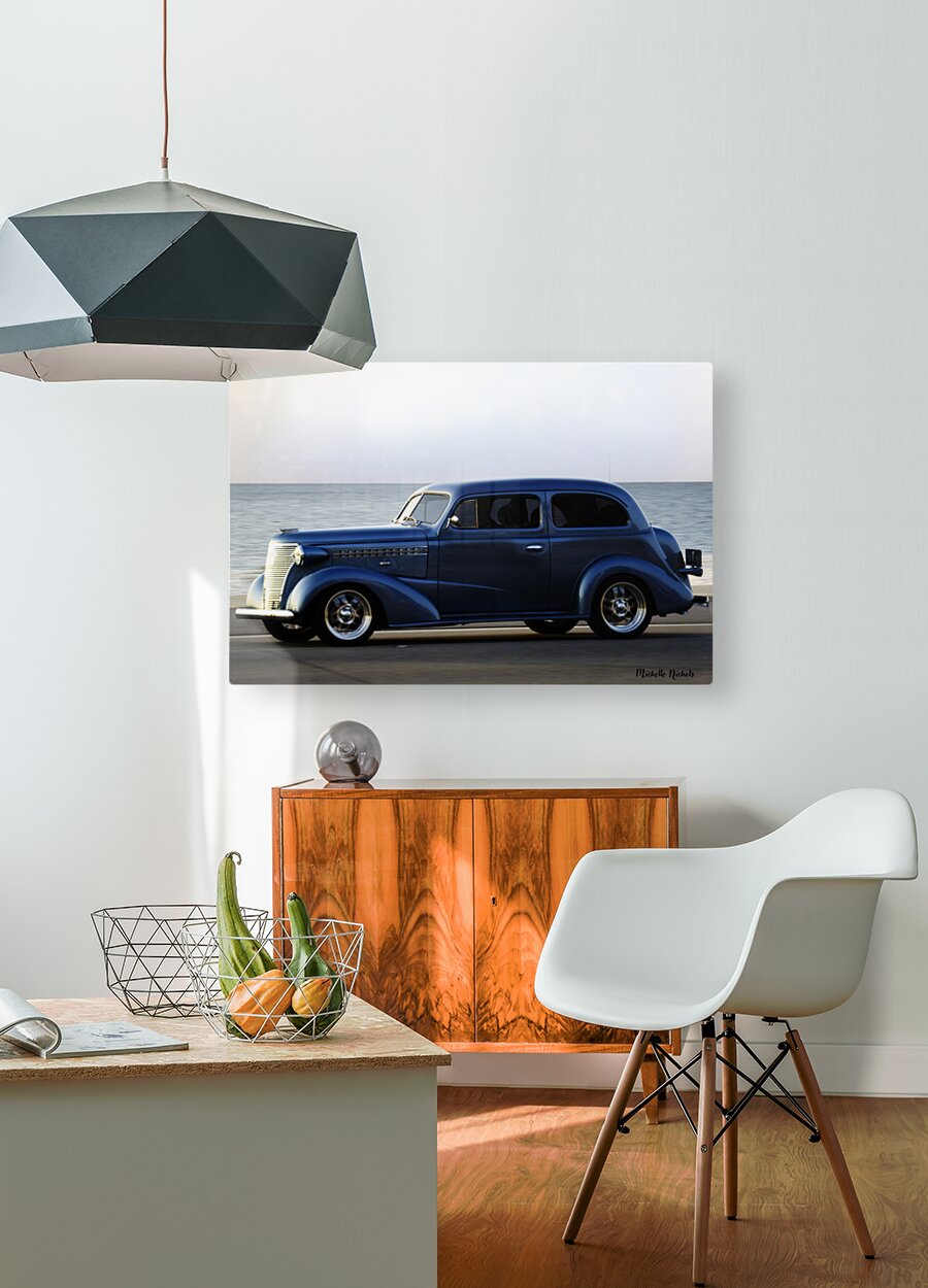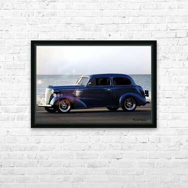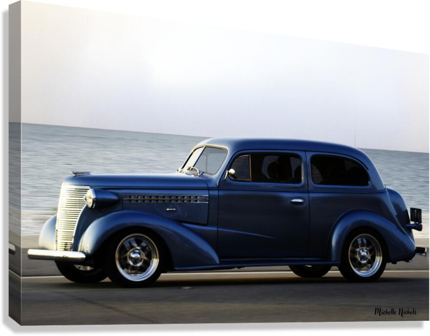 ABOUT THIS ARTWORK: ROYAL BLUE CLASSIC CAR ON THE BEACH