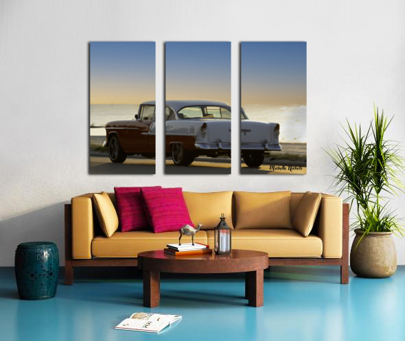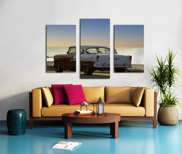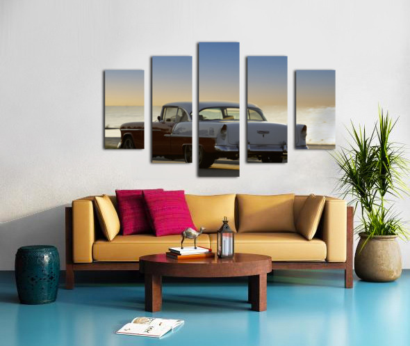 SUR CETTE OEUVRE: RED AND WHITE CLASSIC CAR ON THE BEACH